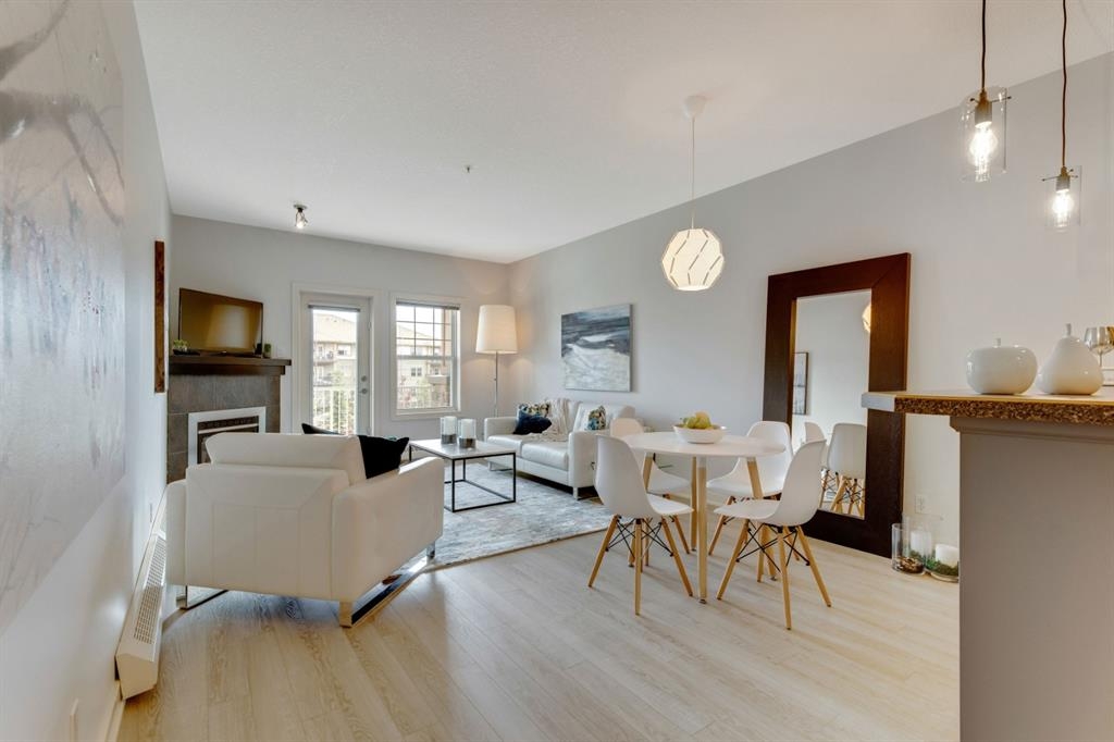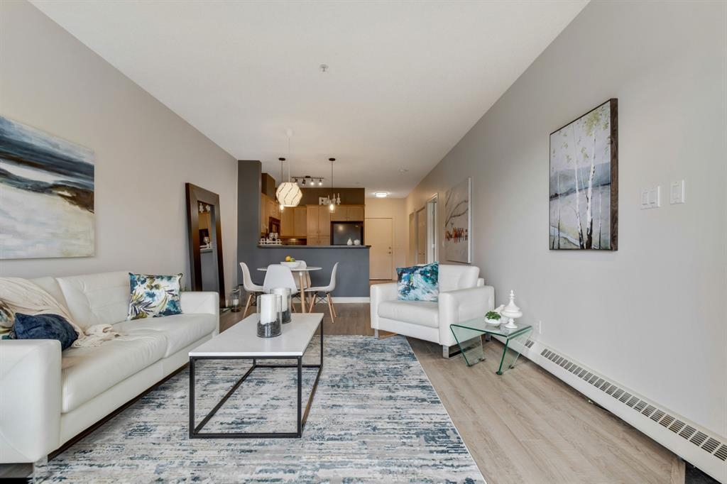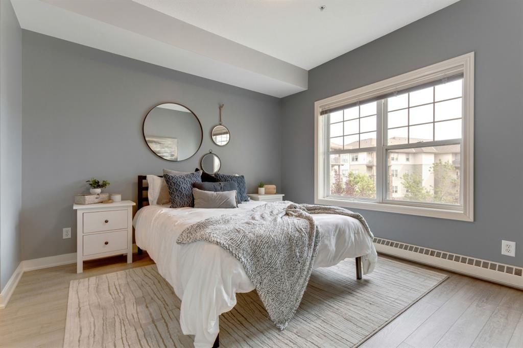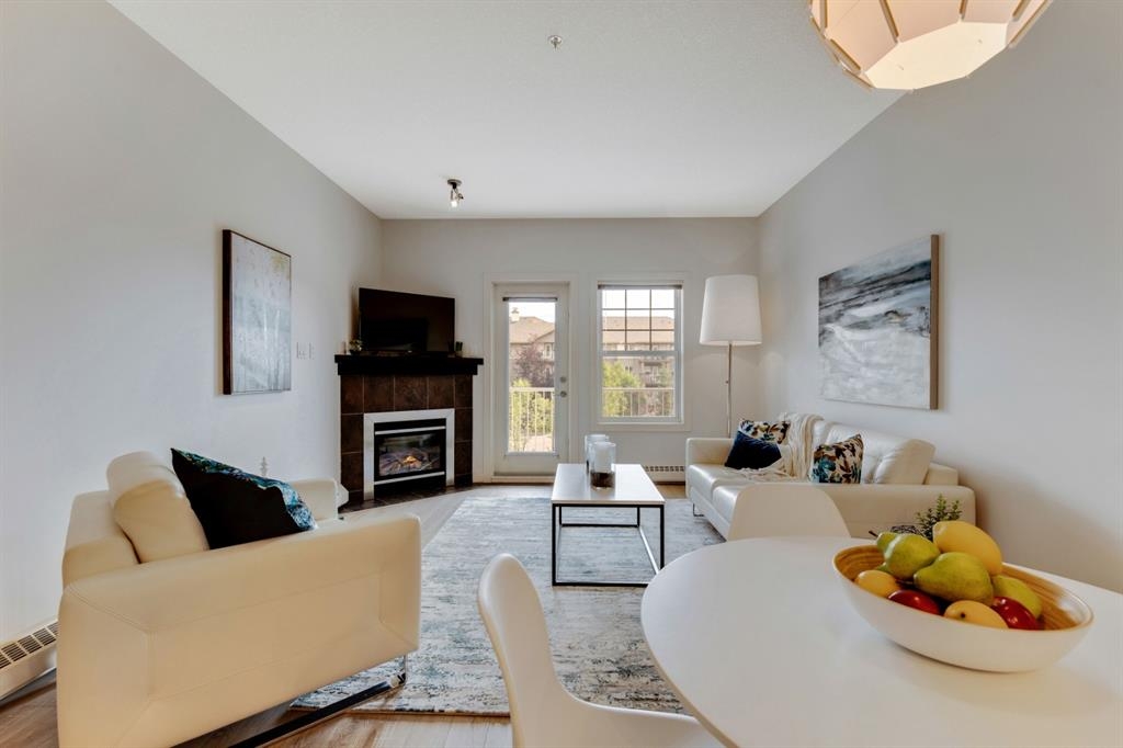 This move-in ready apartment blends style and function with a bright, airy layout designed for today’s lifestyle. The upgraded kitchen features a sleek breakfast bar, modern finishes, and flows seamlessly into the spacious living area anchored by a cozy gas fireplace. Natural light floods the space through large south-facing windows, leading to an oversized private balcony. Perfect for morning coffee or evening unwinding.