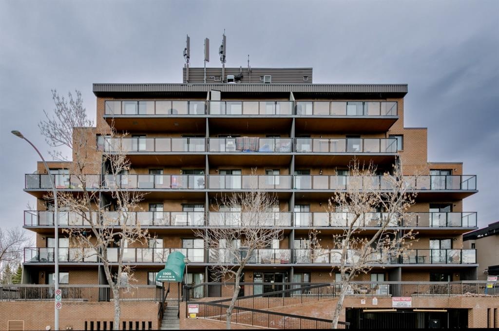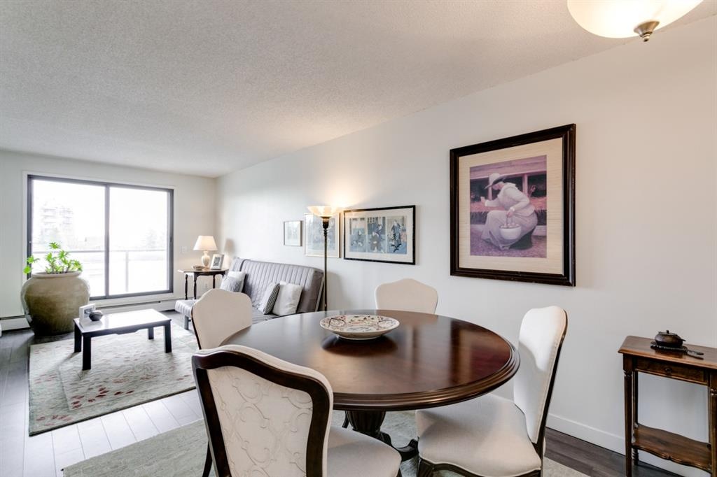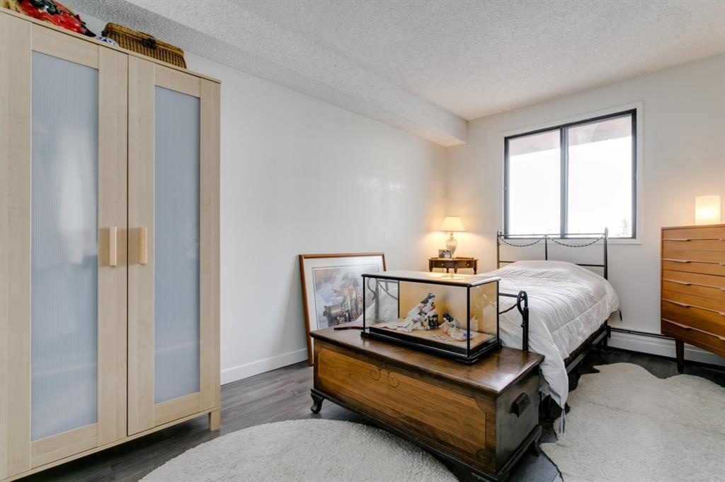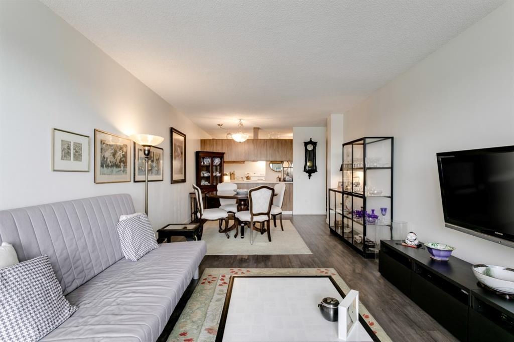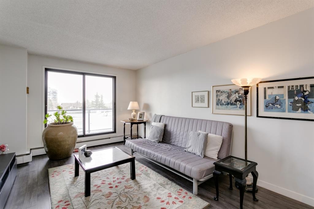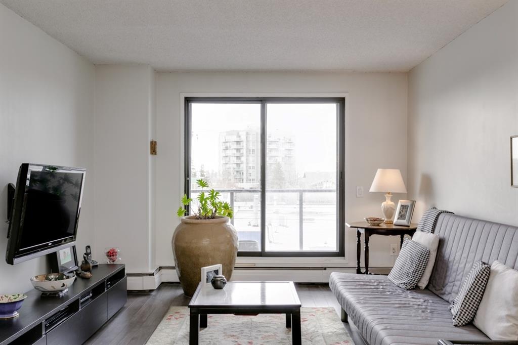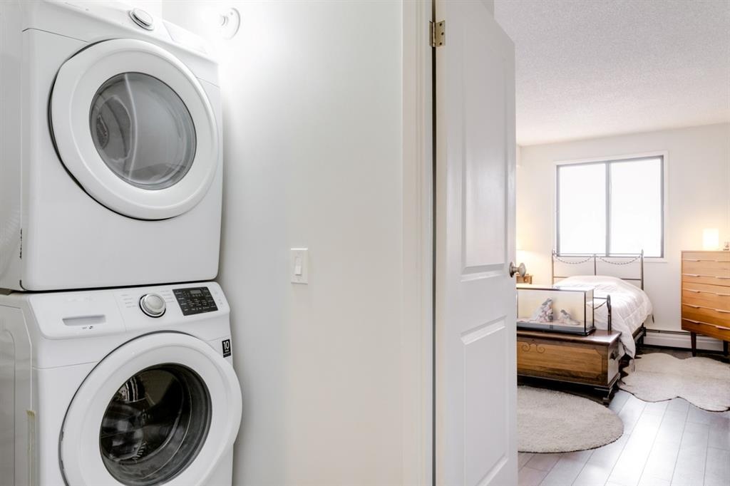 Fantastic 1 bed 1 bath unit with downtown views in a concrete building for under 200k! At 760 sqft this unit has a spacious layout, with new laminate flooring throughout, a large bedroom and huge balcony with amazing downtown views in Killarney Manor. This 4th floor unit has been meticulously kept and features an open concept living/dining room, plus a large kitchen with tons of storage. This home also was built with storage in mind; an additional storage room could be used as a pantry as well as a oversized front closet as well as a laundry room with additional storage and a newer washer/dryer. Additional features include assigned parking stall in the heated underground, a social room, and a fantastic 7th floor rooftop patio surrounded by panoramic views in all directions. Available for quick possession in this fantastic building, in this prime central location just minutes to downtown & shopping, Shaganappi golf course & LRT!