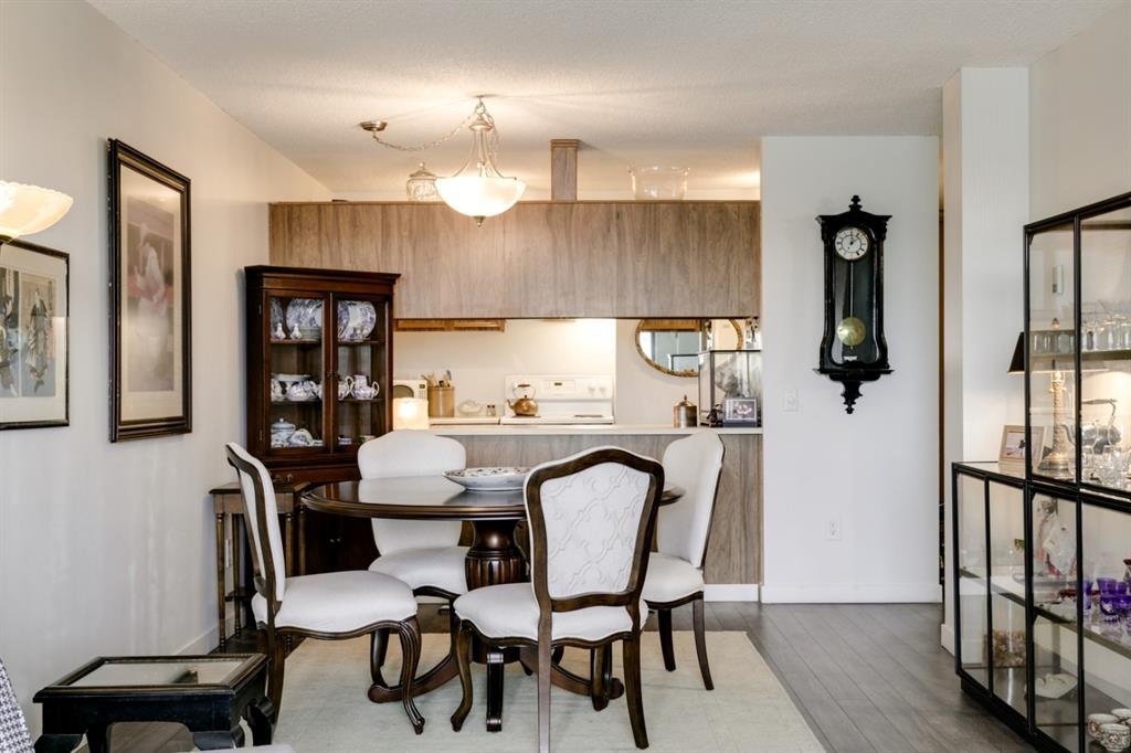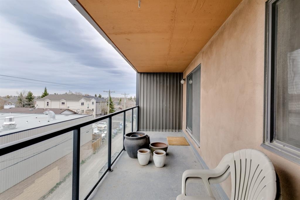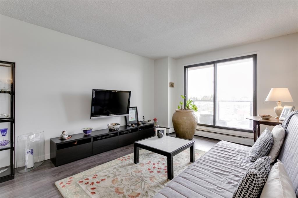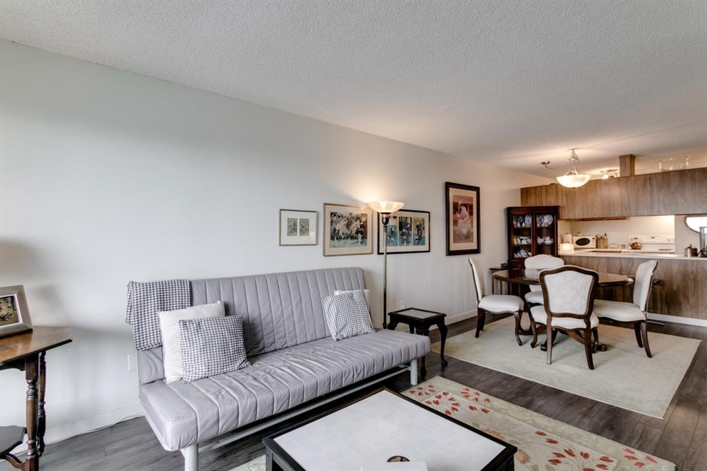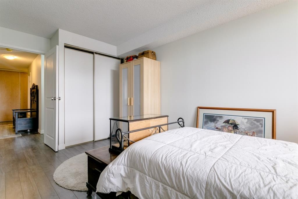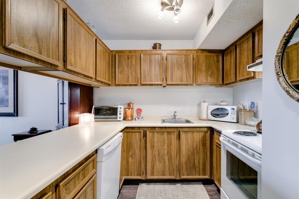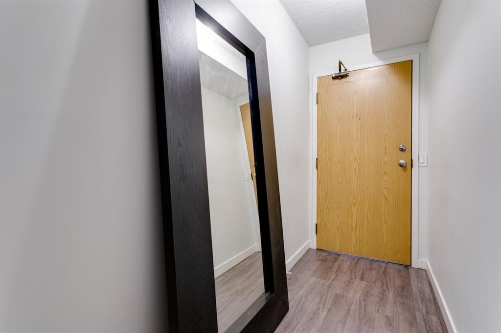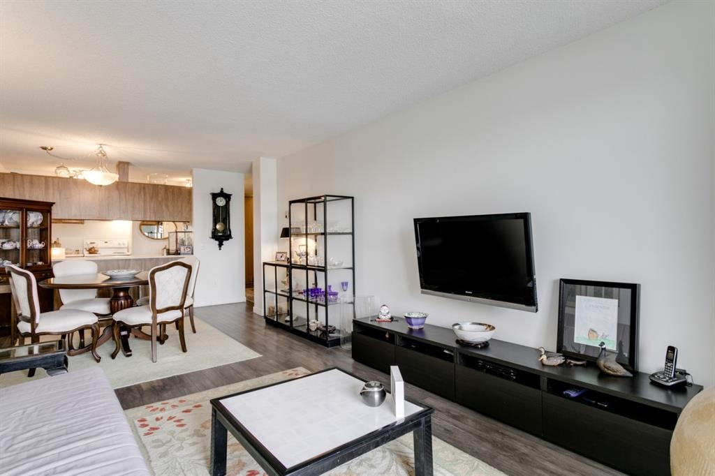 Fantastic 1 bed 1 bath unit with downtown views in a concrete building for under 200k! At 760 sqft this unit has a spacious layout, with new laminate flooring throughout, a large bedroom and huge balcony with amazing downtown views in Killarney Manor. This 4th floor unit has been meticulously kept and features an open concept living/dining room, plus a large kitchen with tons of storage. This home also was built with storage in mind; an additional storage room could be used as a pantry as well as a oversized front closet as well as a laundry room with additional storage and a newer washer/dryer. Additional features include assigned parking stall in the heated underground, a social room, and a fantastic 7th floor rooftop patio surrounded by panoramic views in all directions. Available for quick possession in this fantastic building, in this prime central location just minutes to downtown & shopping, Shaganappi golf course & LRT!