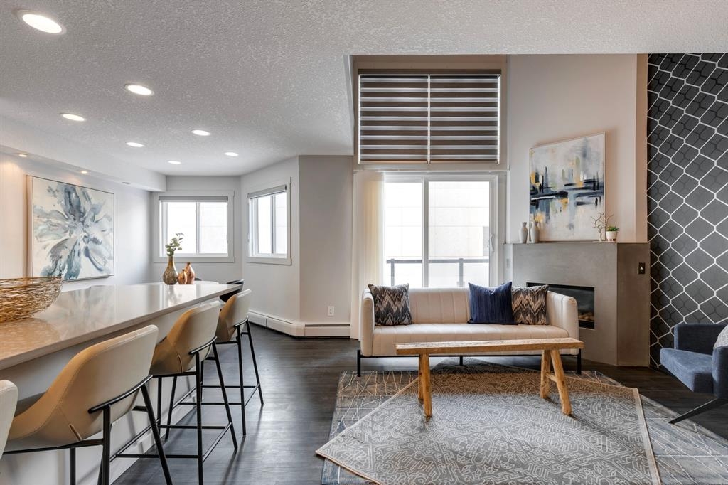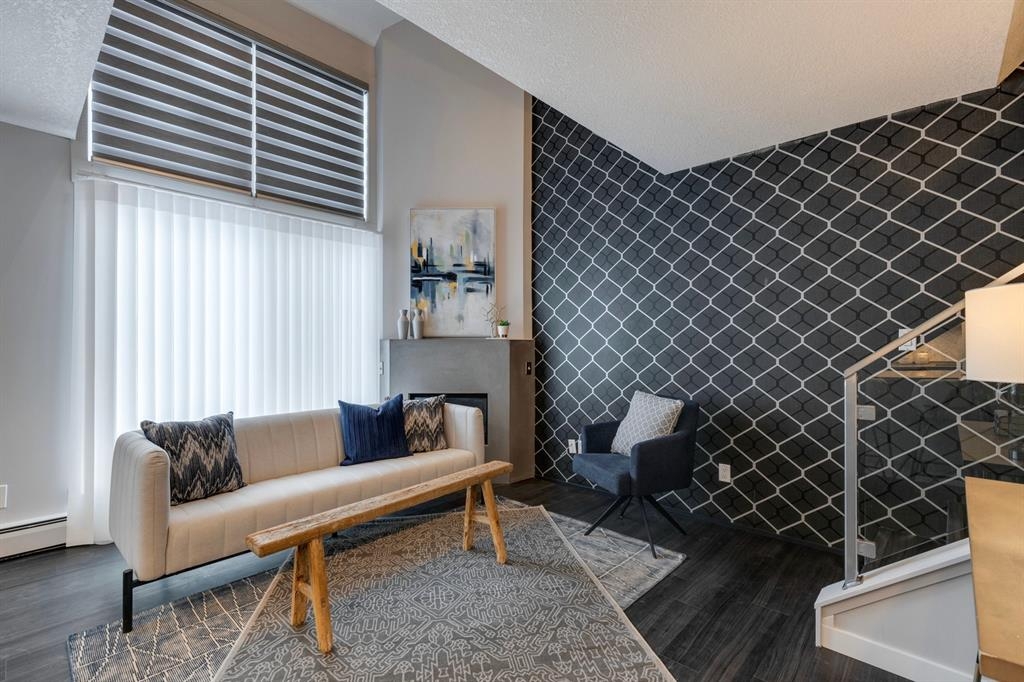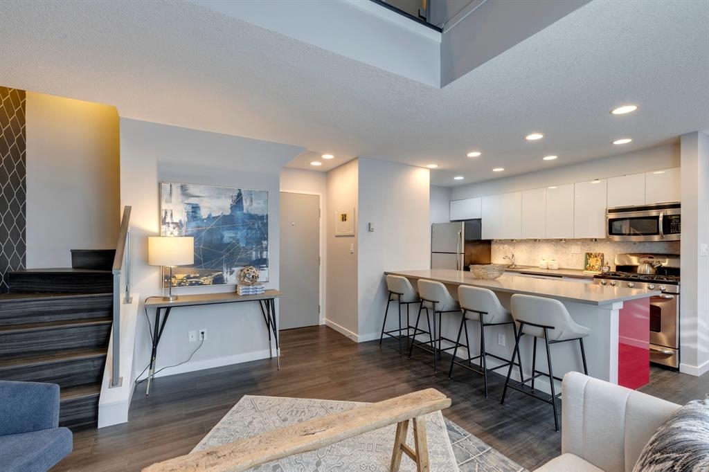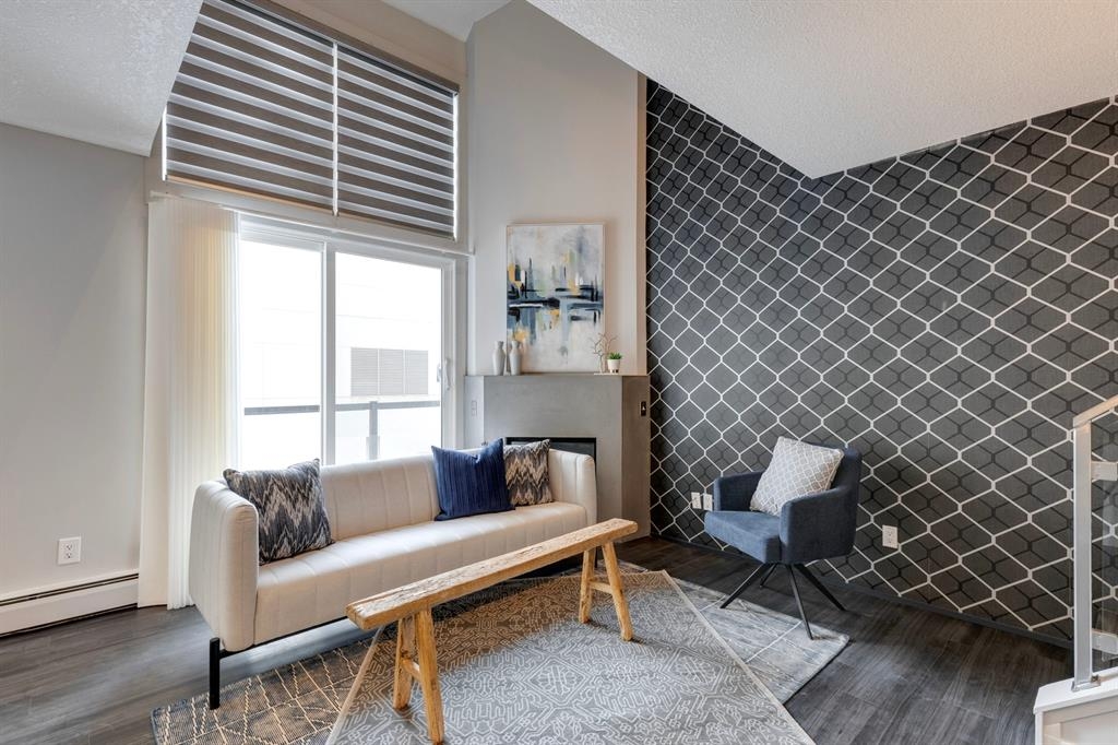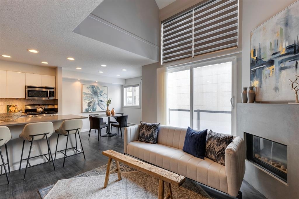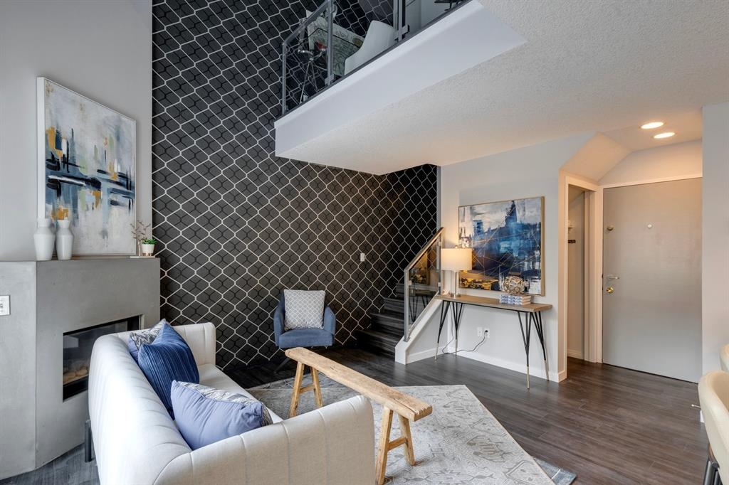 If you’re looking for a modern and unique renovated loft in the heart of downtown, you have it. This two floor 1 bed/1 bath + den loft has everything you need to enjoy. As you enter on the main floor you will notice the open concept, modern colour palette and layout which is ideal for entertaining. A large island overlooks the living space and overlooks a newer modern kitchen with plenty of counter space, stainless steel appliances, an area for dining and laundry tucked away in the corner. As you flow into the south facing living room you can get cozy and enjoy those winter evenings by the fireplace or head upstairs to your flex space/den which could be used as an office or a home gym. Adjacent to the den is a large bedroom and 4-piece bath. Other features include a sunny south facing private patio, one parking stall, brand new flooring, new blinds and the unit has been freshly painted. Enjoy the ability to walk a few steps to Alforno, the Peace Bridge, Eau Claire and more, this central location will have you enjoying everything Calgary’s inner city has to offer.