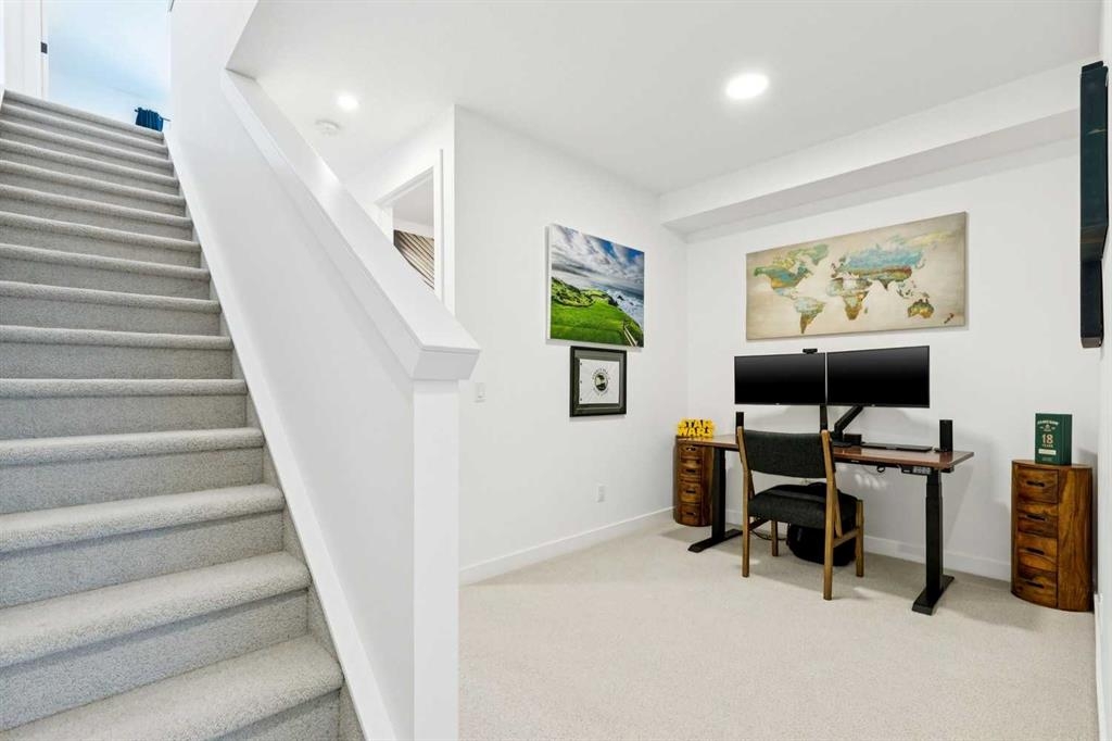 Experience elevated urban living in this stunning luxury townhome offering unobstructed views of Calgary’s downtown skyline. Sitting at 2,648 sq. ft. of thoughtfully designed living space, 3 bedrooms, 3.5 bathrooms, a rooftop loft and patio, a lower-level flex space, and a private yard, this home delivers a rare combination of luxury, space, and versatility. From the moment you arrive, the quality and attention to detail are evident. A west-facing front patio welcomes you in and sets the tone for the seamless indoor-outdoor lifestyle this home was designed for. Inside, the open-concept main floor is ideal for entertaining and features upscale finishes and extensive upgrades throughout. The dining area overlooks the front patio and flows effortlessly into the chef-inspired kitchen, complete with double islands, upgraded backsplash, stainless steel appliances, and exceptional storage. The spacious living room is anchored by a cozy fireplace and opens onto a private back deck with a gas line, perfect for summer grilling and relaxed evenings at home. Completing this level is a powder room perfectly placed adjacent to the kitchen for guests. The second level offers two generously sized bedrooms on each end of the home providing privacy and natural light throughout the day. The east-facing bedroom comes complete with a spacious 5-piece ensuite and the west-facing bedroom has access to the centrally located 4-piece This floor also includes convenient laundry with an upgraded stone countertop and an additional flex space ideal for a home office or reading lounge. The top floor is truly the showpiece. A spacious primary retreat features a walk-in closet and spa-inspired ensuite, while the adjoining upper lounge opens onto the spectacular rooftop patio. Complete with patio lighting and a fire table, this space feels magical and is the perfect setting to enjoy Calgary’s warm summer nights with the downtown skyline as your backdrop. The fully developed walkout lower level adds even more flexibility, offering a tandem attached garage and a bright flex room overlooking the fenced yard, ideal for a home gym, office, or creative studio. Mature trees and upgraded landscaping with stonework and a lower pathway enhance the outdoor experience, while three private patio spaces provide exceptional options for entertaining or relaxing. Additional features include central air conditioning, custom window coverings including blackout blinds in the primary suite, Lux windows throughout, upgraded epoxy flooring and custom garage cabinets, smart home capabilities, and numerous thoughtful upgrades that elevate everyday living. Located steps from trendy shops, restaurants, and cafés and just minutes to downtown, this home offers unmatched walkability without compromising space or luxury.